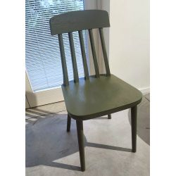 Moderner Holzstuhl, gekennzeichnet durch eine Rückenlehne mit fünf individuell gefertigten Massivholzspindeln. Ideal für die Einrichtung moderner Wohn- und Objektumgebungen.