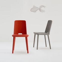 Designstuhl mit einfachen Proportionen und raffinierten Linien, die seinen Einsatz in jeder Umgebung vielseitig machen.