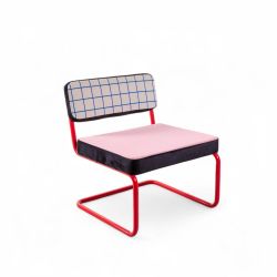 - Rückenlehne mit blauem Gittermuster – kombiniert mit der rosa Sitzfläche und dem roten Schlittengestell;