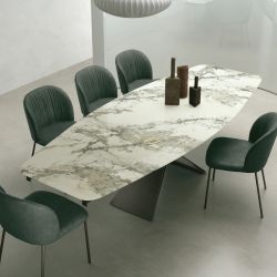 Ronda verleiht dem Esszimmer eine starke Persönlichkeit. Der Tisch hat einen gebogenen, lackierten Metallsockel und eine ausziehbare Platte mit zwei seitlichen Verlängerungen.