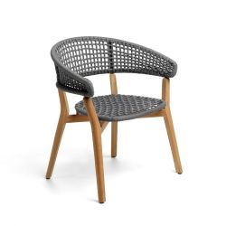 Der Stuhl Moon ist modern und designt und besteht aus natürlichem Teakholz mit Armlehnen und Rückenlehne aus Aluminium, die mit einem Geflecht aus grauen synthetischen Stoffschnüren bedeckt sind.