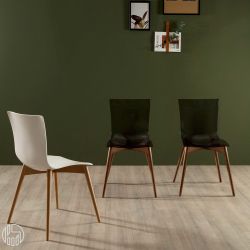 Die vierbeinige Struktur ist aus schwarz gebeiztem Holz, Nussbaum Canaletto oder dunkler Eiche. Der geschwungene Sitz besteht aus Technopolymer und ist in glänzendem Weiß oder transparentem Rauchgrau erhältlich.