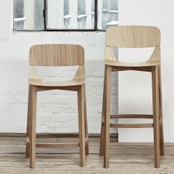 Der Hocker Leaf in dieser Version mit Rückenlehne wurde entwickelt, um mehr Komfort zu gewährleisten. Die Formen und Materialien sind die gleichen wie beim gleichnamigen Holzstuhl.