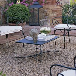 Niedriger Tisch, ideal zur Vervollständigung des Entspannungsbereichs im Garten, aus verzinktem Eisen und graphitfarbenem pulverbeschichtetem Edelstahl .