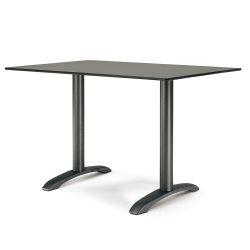 Das rechteckige Doppel-Tischuntergestell für Bars und Restaurants verfügt über zwei Standfüße aus Stahlrohr ∅ 76 mm und zwei 63.5 cm lange Ableger mit regulierbaren Füßen. Es passt zu jeder Plattensorte.