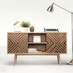 Diese moderne Anrichte ist folgenderweise zusammengesetzt: 2 Fächer mit Schiebetüren, 2 Schubladen und 1 offenes Fach mit zwei regulierbaren Einlegebögen, sodass es viel Platz zur Ablage von Gegenständen gibt.