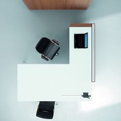 Chefschreibtisch mit L-förmiger Platte, Schubladenelement und Mehrzweckfach.