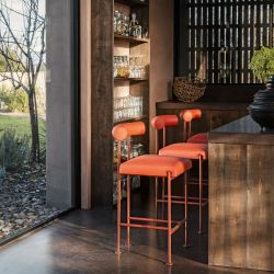 Der Qua-ndo-Hocker zeichnet sich durch ein elegantes, vierbeiniges Metallgestell aus, das mit einem vollständig gepolsterten Sitz und einer Rückenlehne für außergewöhnlichen Komfort kombiniert ist.