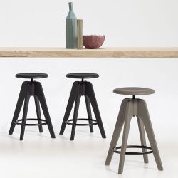 Die vierfüßige Struktur ist aus Massivholz mit einem schwarz lackierten Metallring für die Fußstütze. Dieser Made in Italy Hocker ist aus Esche natur oder in verschiedenen Farben lackiert oder Eiche natur.