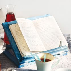 It can be adjusted to 3 angles and has a fold-away page holder rod.