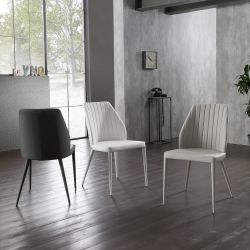 Metal chair with a soft, enveloping backrest decorated with a quilted motif of vertical stripes.