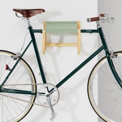 René is composed of two elements: a steam-bent wooden sledge frame and a fabric sling. This wall-mounted bike rack, with simple design and small sizes, offers a functional solution to hang and display bicycle inside own home. At the bottom has got an additional space to place a helmet and jackets.