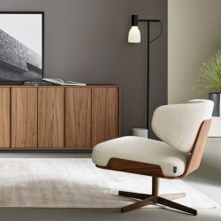 Its sinuous profile comes from a curved laminated wood shell, a distinctive element that gives visual lightness and at the same time solidity to the structure: it is available in the canaletto walnut or carbon oak variants.