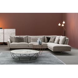 In the composition proposed here, the Skid sofa is made up of a side element with two seat cushions and a large chaise longue.