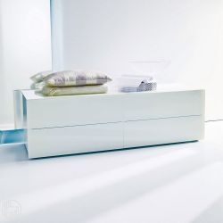 Modern chest of drawers perfect for decorating bedrooms or entrances in a simple and elegant way. This chest of drawers is made of wood, with matt lacquered sides and top and fronts in glossy colored glass.