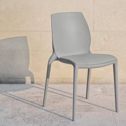 Stackable chair with integral structure in polypropylene and glass fiber. Its sinuous and curvilinear shape is accentuated by the continuity of the material.