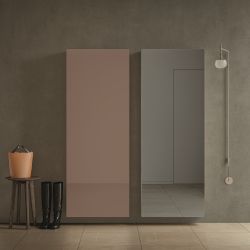 The structure in ecological recycled wood panels is available in white laminate or in lacquered colors with a matt finish. The door is mirrored and opens with a vertical profile in black aluminum.