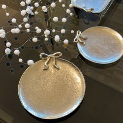 The design, embellished with a delicate decorative bow in the same color as the plate, adds a distinctive touch that makes it perfect as a furnishing element or as a base for compositions and centerpieces.