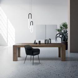 This wooden table has a striking personality and presence, making it a bold furnishing element for the dining room. Mini-Brooklyn is crafted from solid textured oak, available in a wide range of finishes.
