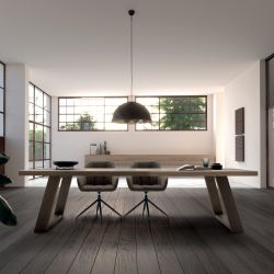 The Wood tabletop can be customized in size, up to a maximum of 350 x 130 cm. It can also be equipped with bayonet extension leaves with straight edges (one on each side), measuring 50 x 3.5 cm each.