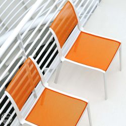 Outdoor chair with metal frame varnished white. Seat and back are made of metal net available in orange colour. This garden chair is stackable.