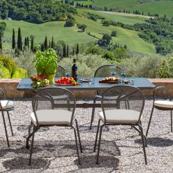 Suitable for every outdoor area, this garden table is in varnished iron and has got steel rectangular top with central hole for parasol.