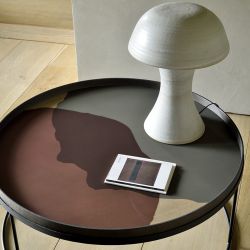 Also designed as a removable shelf for the coffee table, the Round tray is made of wood , with a glass base available in various finishes, and hand-decorated using the silk-screen printing technique.