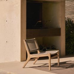 Harmonious lines and innovative materials for the new lounge chair from the Jack collection. Featuring a Teak wood structure and a beige rope seat-back weave, in 100% polypropylene. The woven seat is anti-mold, hypoallergenic, resistant to bacteria and chlorine.