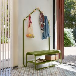 Funambule reinvents the concept of organization thanks to a 3-in-1 solution that combines a comfortable bench , a practical shelf and seven wooden hooks arranged at different heights.