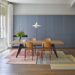 To furnish the living area, the Canevas Geo carpet is perfect combined with the coordinated cushions .