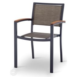 This chair is made of aluminum and upholstered in textilene . It has armrests covered with techno-wood inserts .