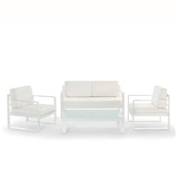 This outdoor living room combines elegance and geometric design, and is composed of a two-seater sofa , two armchairs and a coffee table with a glass top , ideal for enhancing terraces, gardens and verandas with style and refinement.