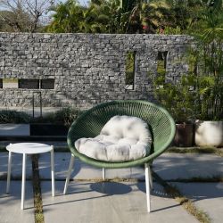 The frame is in painted aluminum for outdoor use. The seat and backrest, with welcoming shapes, have a weave made of polyester rope. The soft seat cushion, quilted in 100% water-repellent Olefin fabric, is removable.