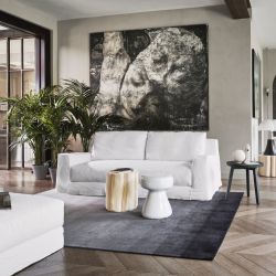 The solid wood frame with polyurethane foam shell blends with large seat and back cushions made with a soft layer of goose down and pocket springs, to increase comfort. In all its versions, the LOLL collection is completely and easily removable.