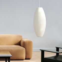 The Nelson Cigar pendant lamp is inspired by silk-covered lamps.