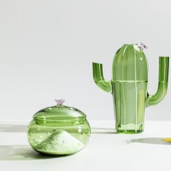 Handcrafted from borosilicate glass, this cactus-shaped box is perfect for adding a touch of color to your home. It can be used in a variety of ways: as a container for sweets, sugar, cookies, or small objects. It features a small pink flower on the top of the lid.