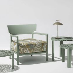 Philippe Starck's Cara armchair presents itself with a new look, upholstered in Chile Palm fabric specially designed for outdoor spaces.