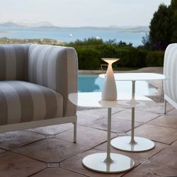 This version stands out for its white painted steel frame, designed to withstand the elements without losing its original shine. The back-painted tempered glass top creates a play of depth and reflections, making it a precious and functional furnishing accessory for gardens, poolsides, and urban terraces. It is available in various heights and shapes, designed to be used individually or in groups to create dynamic compositions.