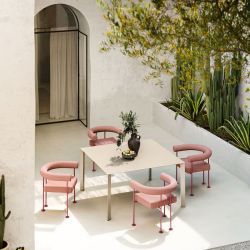 The four-legged frame is made of metal. The tabletops are available in various finishes, including wood veneer, (MDF), lacquered wood, and HPL. Only glass or ceramic tops are suitable for outdoor use.