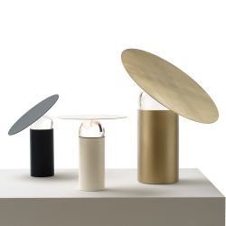 This table lamp is characterized by the elegant glass sphere in the center, which allows you to orient the lampshade and direct the light where you want. The structure is in painted metal and the light source is LED.