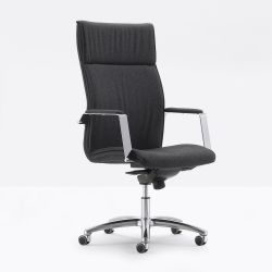 Seat and high backrest are padded and covered. The chromed steel armrests are partially upholstered. Various coverings are available, in fabric or imitation leather, including fireproof or water-repellent versions. Internally the shell is in beech plywood.