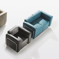 The sofa has a particularly square line, with well-defined and separate cushions.