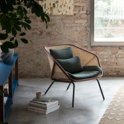 The enveloping and light body is made of a wooden frame and a Vienna straw seat. The four legs, which support the structure, are made of black painted metal. The soft cushion is available in various coverings and colors.