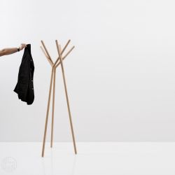 This modern coat hanger with a Nordic taste is available in two versions: entirely in natural beech or with legs in natural beech and lacquered ends. Several color variants to choose from.