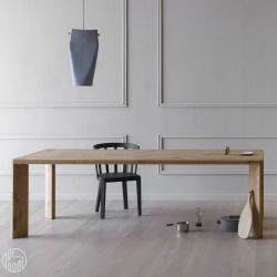 Simple and essential, this fixed rectangular table is entirely made of canaletto walnut, black ash, flamed oak or vintage oak. Top and legs are made in the same finish.