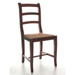 Country style wooden chair, made of solid beech wood. It is characterized by simple backrest slightly curved to make the seat more comfortable, and by the crosspieces with footstool in the lower part of the legs.