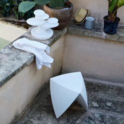 It can be easily stacked and, if turned upside down, can support an elegant round top in transparent glass, which makes the pouf a real side table.