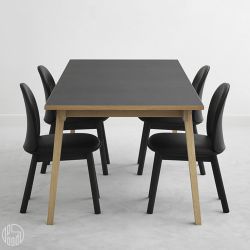 Slice is a fixed table with oak legs and a laminate top finished with a layer of linoleum, a durable, sturdy, scratch- and stain-resistant, and fingerprint-resistant natural material. The edges are oak veneer.