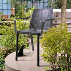 Made of polypropylene, this garden chair is available in various colors with a matte finish. The earth-tone version is made of recycled polypropylene.