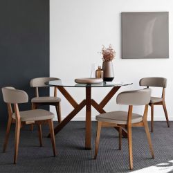 Beech structure is available stained or laquered. The tempered glass top is round and transparent, available with 120 cm or 140 cm diameter.